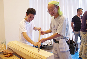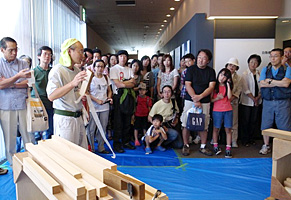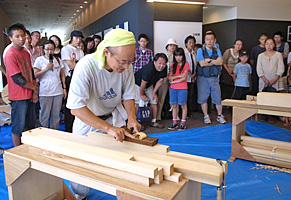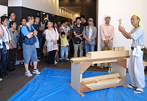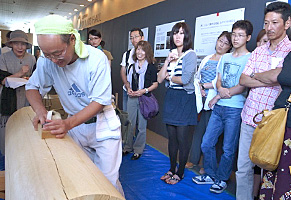 巡回展[棟梁-堂宮大工の世界-]のイベントの一つ、「堂宮大工の技」実演・体験教室を展示会場内に特別スペ-スを設け、2回にわたり開催しました。東京会場と同様、講師は堂宮大工で当館の技能員、北村です。