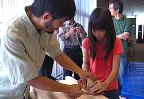 北海道ではこうした体験教室が少ないとのこともあって多くの方々が参加して下さり、ぜひまたやって下さいとの声を頂きました。またお手伝いをして下さった削ろう会の東勝利さん、山口博之さん(左写真)には大変お世話になりました。